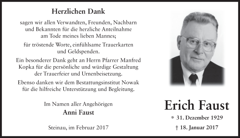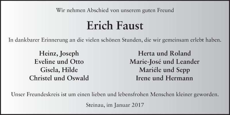 Hier finden Sie alle Traueranzeigen aus der Zeitung, die bisher für Erich Faust erschienen sind. Weitere Traueranzeigen, die in der Zeitung erscheinen, werden hier ebenfalls aufgelistet