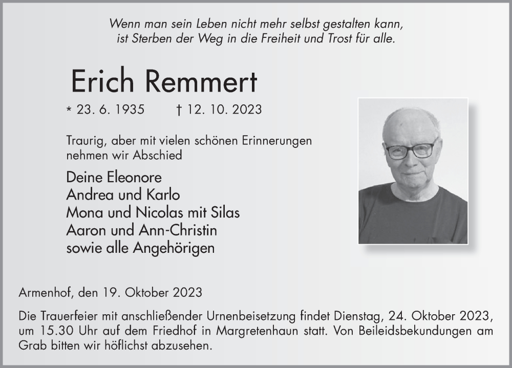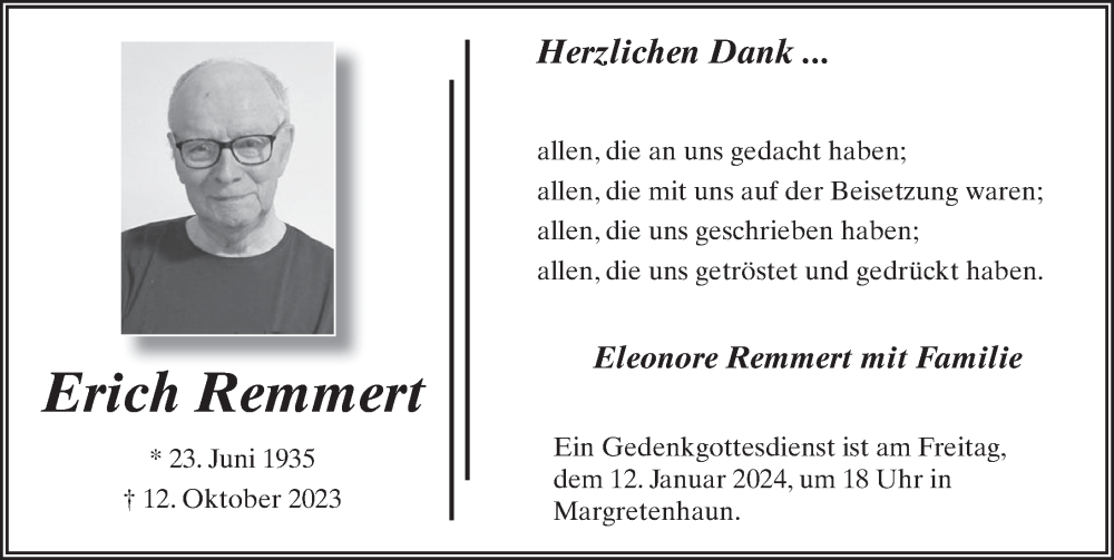 Hier finden Sie alle Traueranzeigen aus der Zeitung, die bisher für Erich Remmert erschienen sind. Weitere Traueranzeigen, die in der Zeitung erscheinen, werden hier ebenfalls aufgelistet