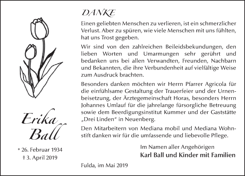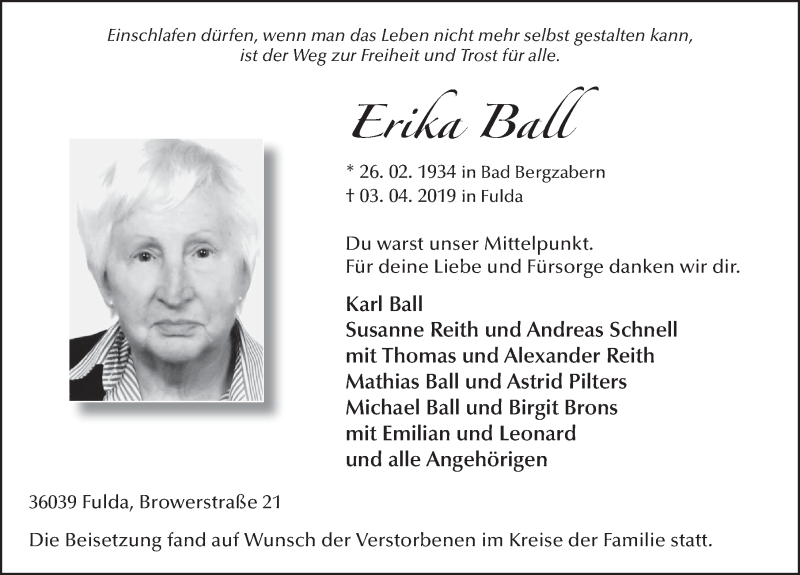 Hier finden Sie alle Traueranzeigen aus der Zeitung, die bisher für Erika Ball erschienen sind. Weitere Traueranzeigen, die in der Zeitung erscheinen, werden hier ebenfalls aufgelistet