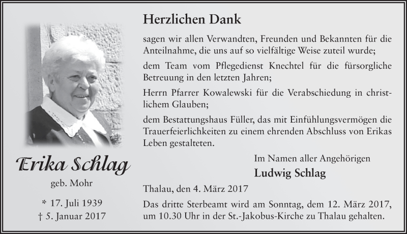 Hier finden Sie alle Traueranzeigen aus der Zeitung, die bisher für Erika Schlag erschienen sind. Weitere Traueranzeigen, die in der Zeitung erscheinen, werden hier ebenfalls aufgelistet