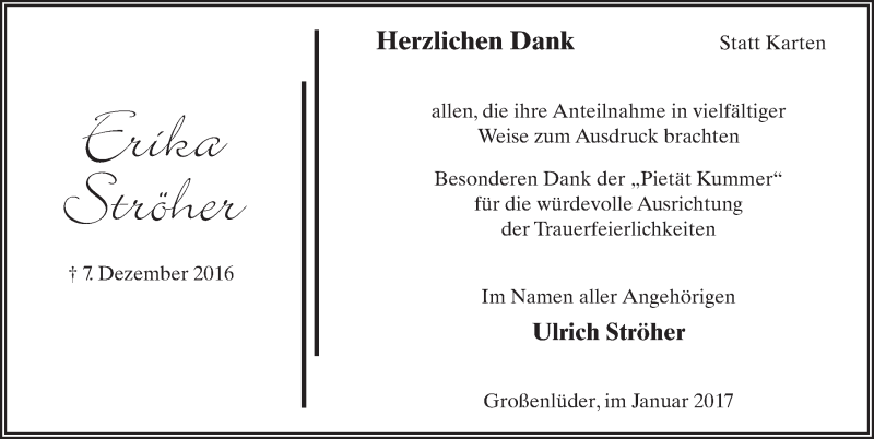 Hier finden Sie alle Traueranzeigen aus der Zeitung, die bisher für Erika Ströher erschienen sind. Weitere Traueranzeigen, die in der Zeitung erscheinen, werden hier ebenfalls aufgelistet