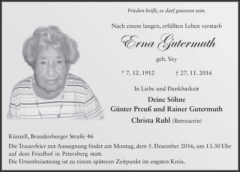 Hier finden Sie alle Traueranzeigen aus der Zeitung, die bisher für Erna Gutermuth erschienen sind. Weitere Traueranzeigen, die in der Zeitung erscheinen, werden hier ebenfalls aufgelistet