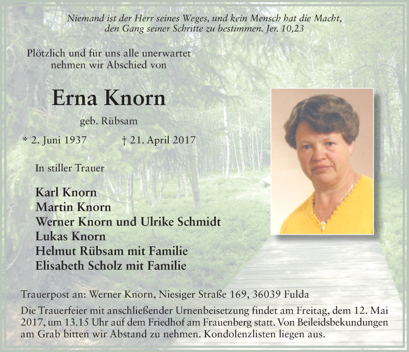 Hier finden Sie alle Traueranzeigen aus der Zeitung, die bisher für Erna Knorn erschienen sind. Weitere Traueranzeigen, die in der Zeitung erscheinen, werden hier ebenfalls aufgelistet