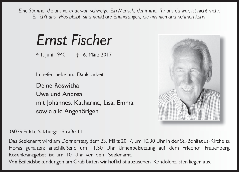 Hier finden Sie alle Traueranzeigen aus der Zeitung, die bisher für Ernst Fischer erschienen sind. Weitere Traueranzeigen, die in der Zeitung erscheinen, werden hier ebenfalls aufgelistet