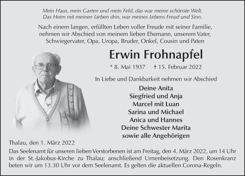 Hier finden Sie alle Traueranzeigen aus der Zeitung, die bisher für Erwin Frohnapfel erschienen sind. Weitere Traueranzeigen, die in der Zeitung erscheinen, werden hier ebenfalls aufgelistet