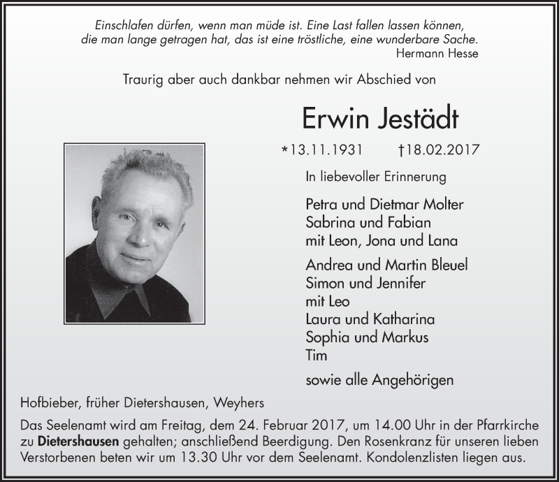 Hier finden Sie alle Traueranzeigen aus der Zeitung, die bisher für Erwin Jestädt erschienen sind. Weitere Traueranzeigen, die in der Zeitung erscheinen, werden hier ebenfalls aufgelistet