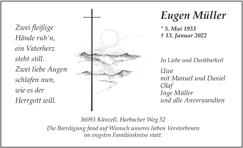 Hier finden Sie alle Traueranzeigen aus der Zeitung, die bisher für Eugen Müller erschienen sind. Weitere Traueranzeigen, die in der Zeitung erscheinen, werden hier ebenfalls aufgelistet