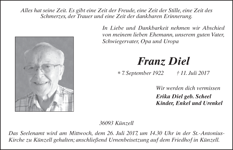 Hier finden Sie alle Traueranzeigen aus der Zeitung, die bisher für Franz Diel erschienen sind. Weitere Traueranzeigen, die in der Zeitung erscheinen, werden hier ebenfalls aufgelistet