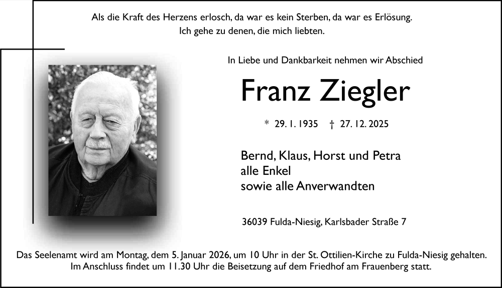 Hier finden Sie alle Traueranzeigen aus der Zeitung, die bisher für Franz Ziegler erschienen sind. Weitere Traueranzeigen, die in der Zeitung erscheinen, werden hier ebenfalls aufgelistet