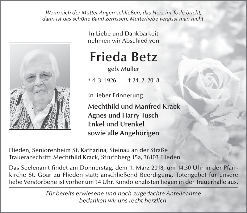 Hier finden Sie alle Traueranzeigen aus der Zeitung, die bisher für Frieda Betz erschienen sind. Weitere Traueranzeigen, die in der Zeitung erscheinen, werden hier ebenfalls aufgelistet