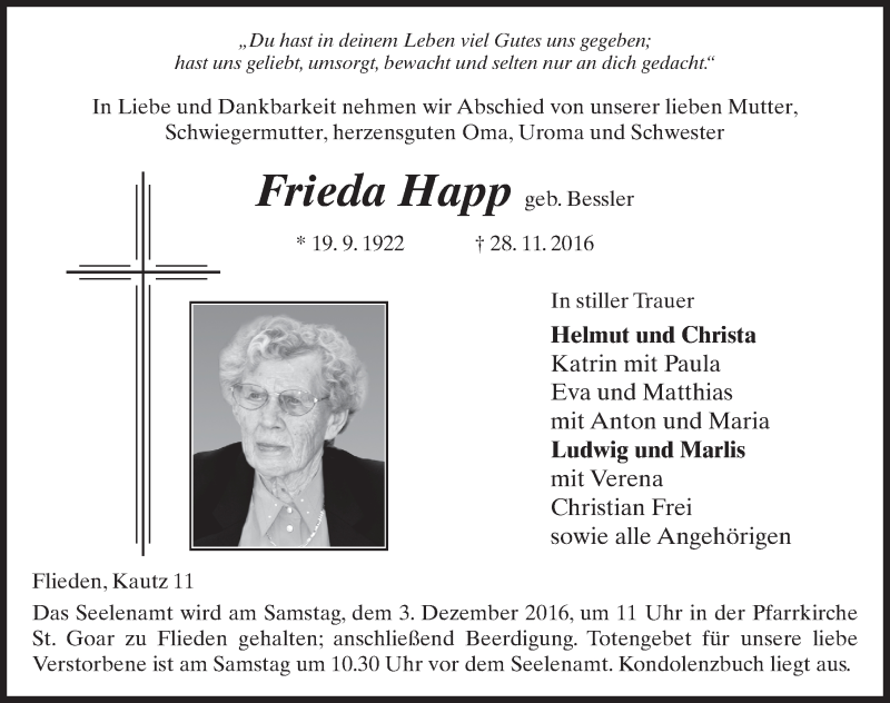 Hier finden Sie alle Traueranzeigen aus der Zeitung, die bisher für Frieda Happ erschienen sind. Weitere Traueranzeigen, die in der Zeitung erscheinen, werden hier ebenfalls aufgelistet