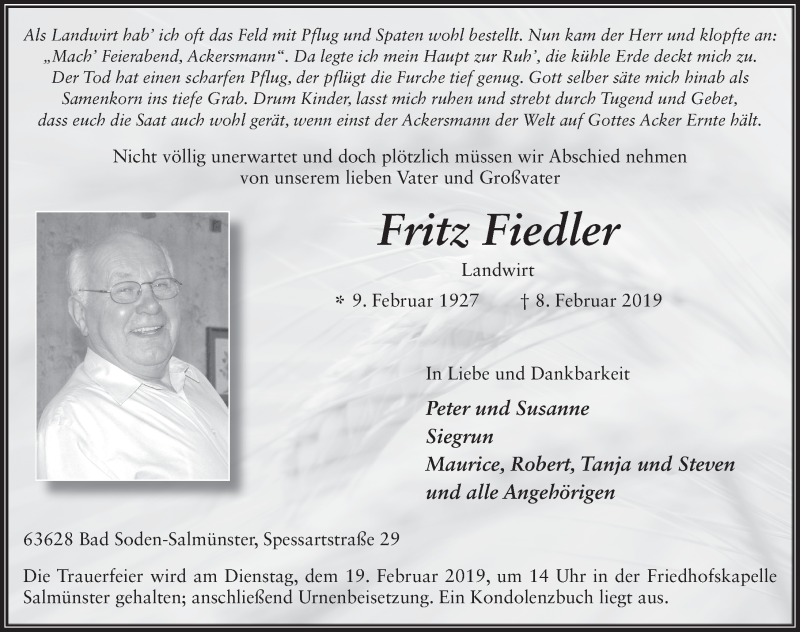 Hier finden Sie alle Traueranzeigen aus der Zeitung, die bisher für Fritz Fiedler erschienen sind. Weitere Traueranzeigen, die in der Zeitung erscheinen, werden hier ebenfalls aufgelistet