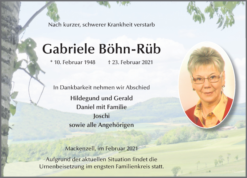 Hier finden Sie alle Traueranzeigen aus der Zeitung, die bisher für Gabriele Böhn-Rüb erschienen sind. Weitere Traueranzeigen, die in der Zeitung erscheinen, werden hier ebenfalls aufgelistet