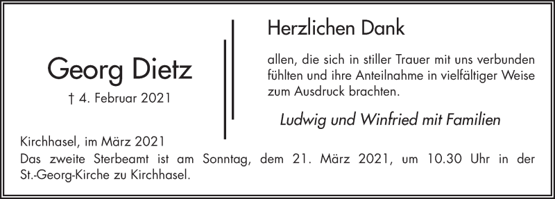 Hier finden Sie alle Traueranzeigen aus der Zeitung, die bisher für Georg Dietz erschienen sind. Weitere Traueranzeigen, die in der Zeitung erscheinen, werden hier ebenfalls aufgelistet