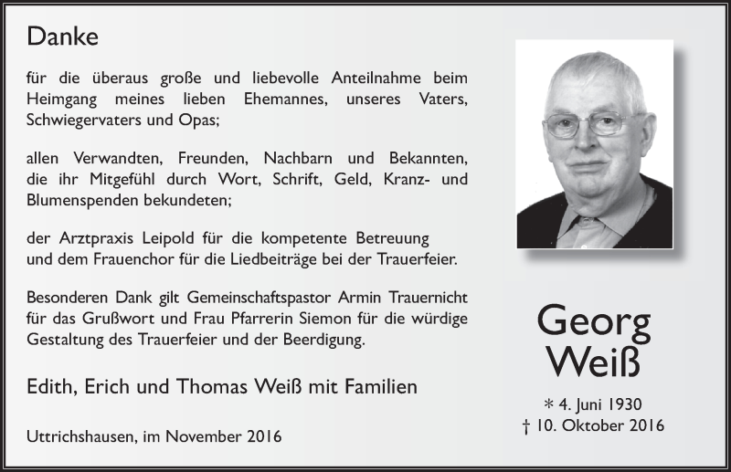 Hier finden Sie alle Traueranzeigen aus der Zeitung, die bisher für Georg Weiß erschienen sind. Weitere Traueranzeigen, die in der Zeitung erscheinen, werden hier ebenfalls aufgelistet