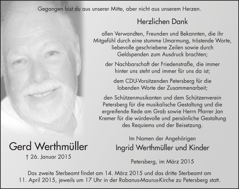 Hier finden Sie alle Traueranzeigen aus der Zeitung, die bisher für Gerd Werthmüller erschienen sind. Weitere Traueranzeigen, die in der Zeitung erscheinen, werden hier ebenfalls aufgelistet