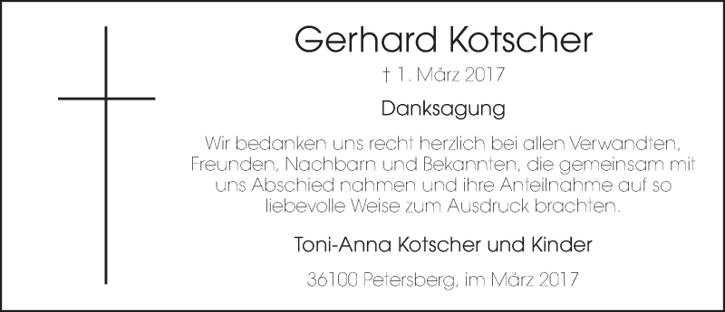 Hier finden Sie alle Traueranzeigen aus der Zeitung, die bisher für Gerhard Kotscher erschienen sind. Weitere Traueranzeigen, die in der Zeitung erscheinen, werden hier ebenfalls aufgelistet