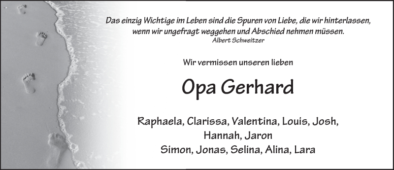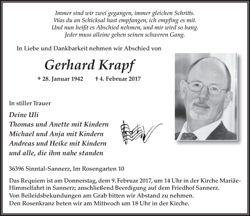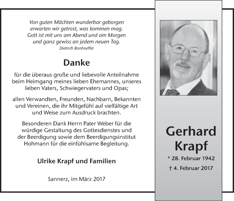 Hier finden Sie alle Traueranzeigen aus der Zeitung, die bisher für Gerhard Krapf erschienen sind. Weitere Traueranzeigen, die in der Zeitung erscheinen, werden hier ebenfalls aufgelistet