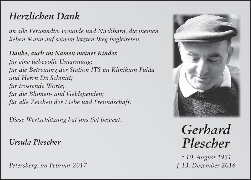 Hier finden Sie alle Traueranzeigen aus der Zeitung, die bisher für Gerhard Plescher erschienen sind. Weitere Traueranzeigen, die in der Zeitung erscheinen, werden hier ebenfalls aufgelistet