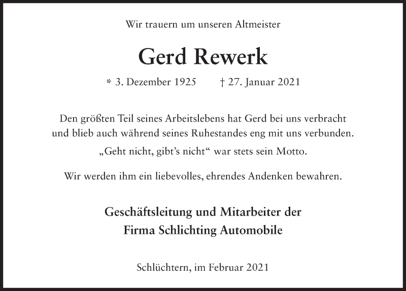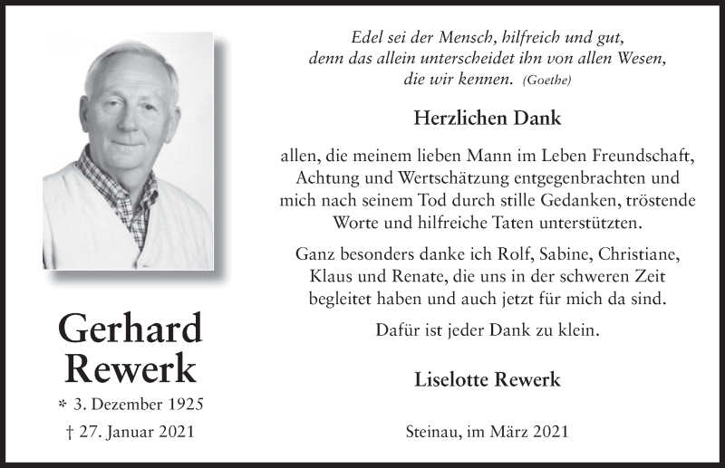 Hier finden Sie alle Traueranzeigen aus der Zeitung, die bisher für Gerhard Rewerk erschienen sind. Weitere Traueranzeigen, die in der Zeitung erscheinen, werden hier ebenfalls aufgelistet