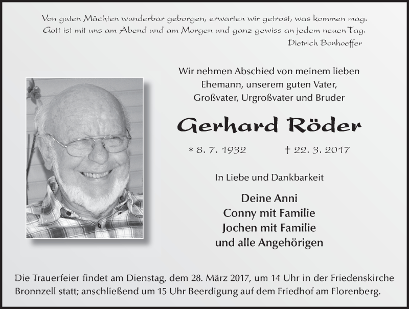 Hier finden Sie alle Traueranzeigen aus der Zeitung, die bisher für Gerhard Röder erschienen sind. Weitere Traueranzeigen, die in der Zeitung erscheinen, werden hier ebenfalls aufgelistet