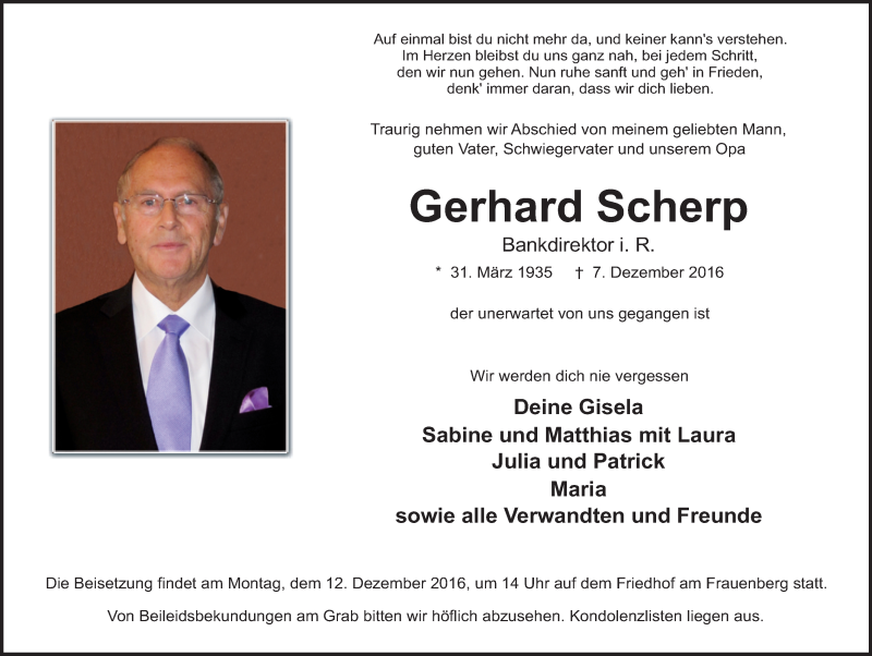 Hier finden Sie alle Traueranzeigen aus der Zeitung, die bisher für Gerhard Scherp erschienen sind. Weitere Traueranzeigen, die in der Zeitung erscheinen, werden hier ebenfalls aufgelistet