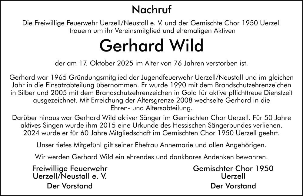 Hier finden Sie alle Traueranzeigen aus der Zeitung, die bisher für Gerhard Wild erschienen sind. Weitere Traueranzeigen, die in der Zeitung erscheinen, werden hier ebenfalls aufgelistet