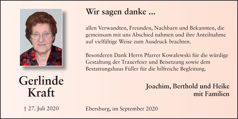Hier finden Sie alle Traueranzeigen aus der Zeitung, die bisher für Gerlinde Kraft erschienen sind. Weitere Traueranzeigen, die in der Zeitung erscheinen, werden hier ebenfalls aufgelistet