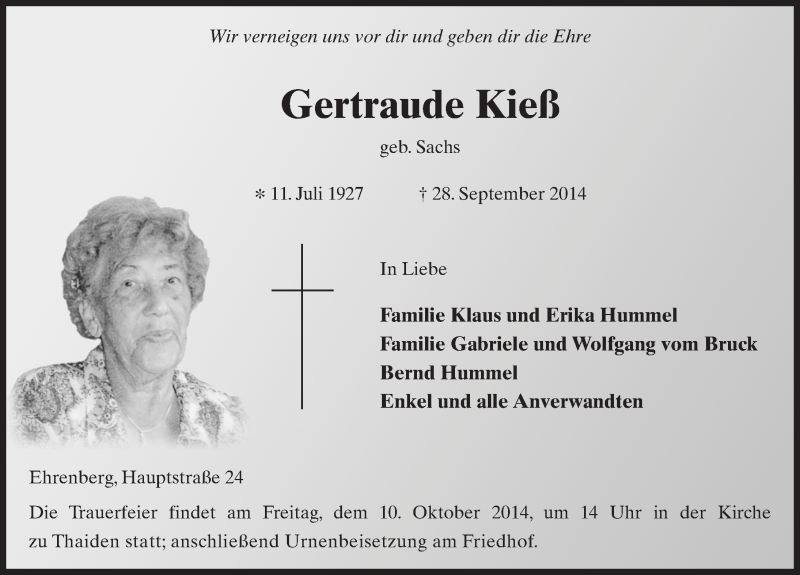 Hier finden Sie alle Traueranzeigen aus der Zeitung, die bisher für Gertraude Kieß erschienen sind. Weitere Traueranzeigen, die in der Zeitung erscheinen, werden hier ebenfalls aufgelistet