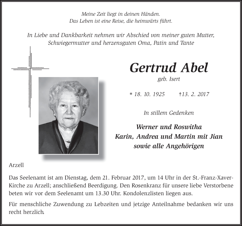 Hier finden Sie alle Traueranzeigen aus der Zeitung, die bisher für Gertrud Abel erschienen sind. Weitere Traueranzeigen, die in der Zeitung erscheinen, werden hier ebenfalls aufgelistet
