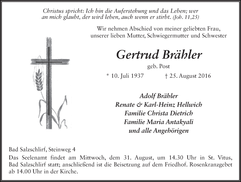 Hier finden Sie alle Traueranzeigen aus der Zeitung, die bisher für Gertrud Brähler erschienen sind. Weitere Traueranzeigen, die in der Zeitung erscheinen, werden hier ebenfalls aufgelistet