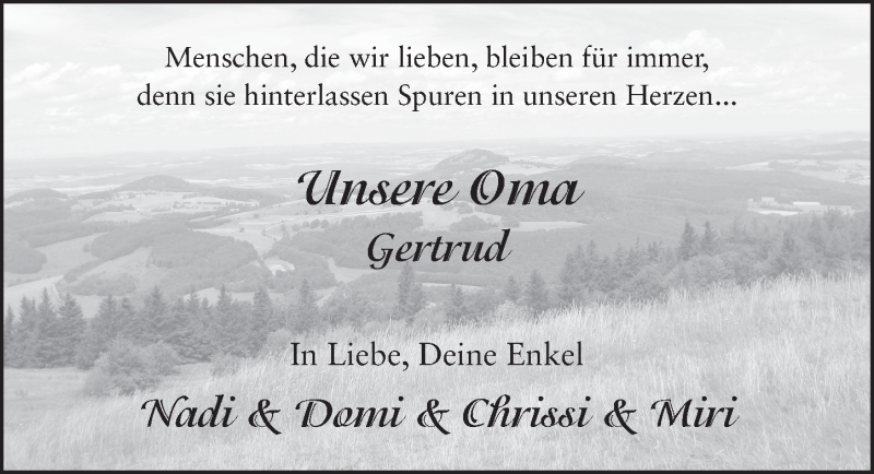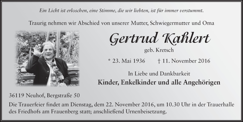 Hier finden Sie alle Traueranzeigen aus der Zeitung, die bisher für Gertrud Kahlert erschienen sind. Weitere Traueranzeigen, die in der Zeitung erscheinen, werden hier ebenfalls aufgelistet