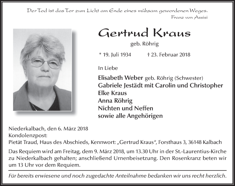 Hier finden Sie alle Traueranzeigen aus der Zeitung, die bisher für Gertrud Kraus erschienen sind. Weitere Traueranzeigen, die in der Zeitung erscheinen, werden hier ebenfalls aufgelistet