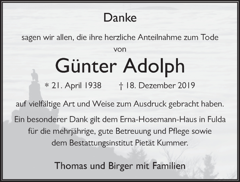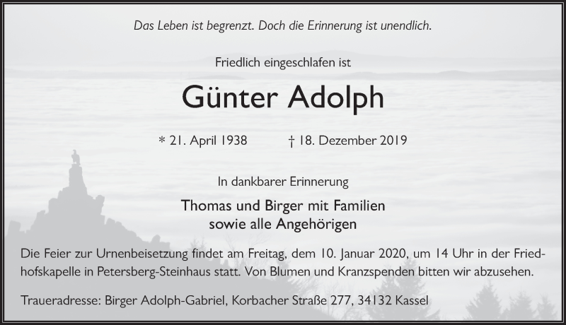 Hier finden Sie alle Traueranzeigen aus der Zeitung, die bisher für Günter Adolph erschienen sind. Weitere Traueranzeigen, die in der Zeitung erscheinen, werden hier ebenfalls aufgelistet