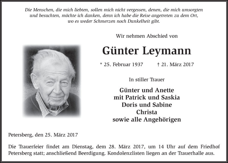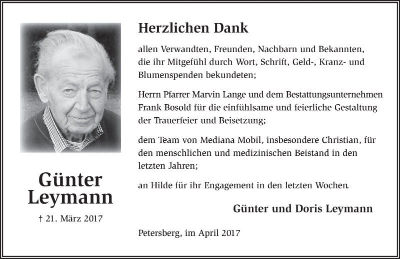 Hier finden Sie alle Traueranzeigen aus der Zeitung, die bisher für Günter Leymann erschienen sind. Weitere Traueranzeigen, die in der Zeitung erscheinen, werden hier ebenfalls aufgelistet