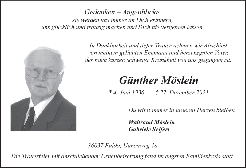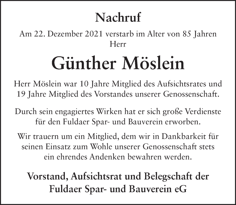 Hier finden Sie alle Traueranzeigen aus der Zeitung, die bisher für Günther Möslein erschienen sind. Weitere Traueranzeigen, die in der Zeitung erscheinen, werden hier ebenfalls aufgelistet