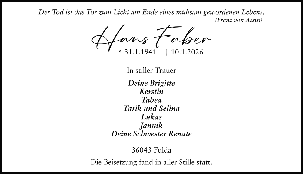 Hier finden Sie alle Traueranzeigen aus der Zeitung, die bisher für Hans Faber erschienen sind. Weitere Traueranzeigen, die in der Zeitung erscheinen, werden hier ebenfalls aufgelistet