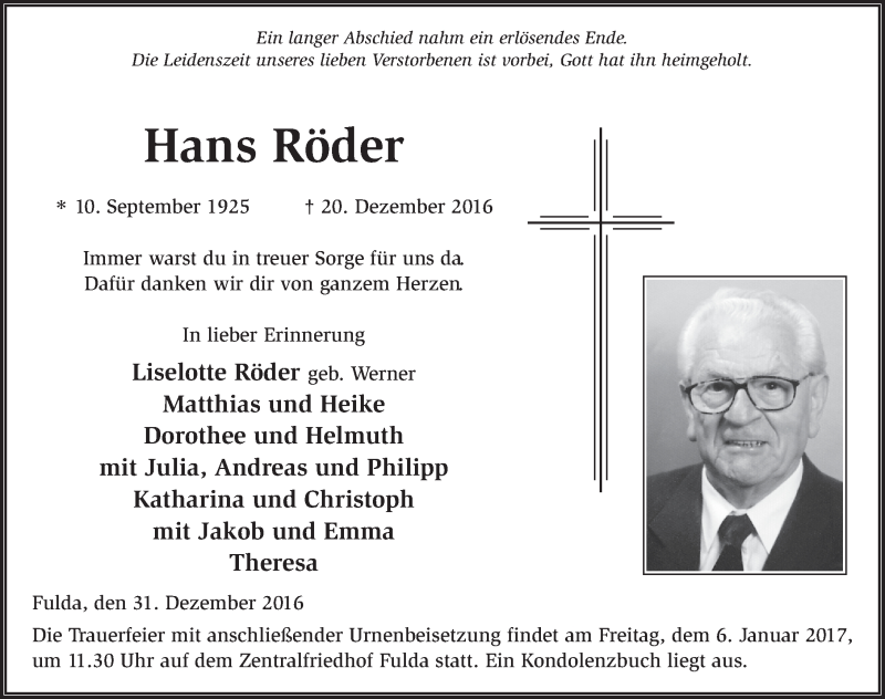 Hier finden Sie alle Traueranzeigen aus der Zeitung, die bisher für Hans Röder erschienen sind. Weitere Traueranzeigen, die in der Zeitung erscheinen, werden hier ebenfalls aufgelistet