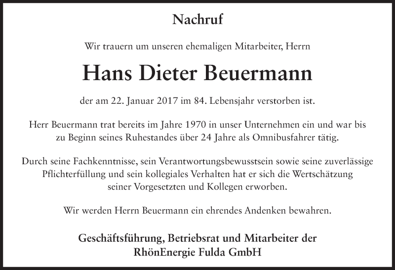 Hier finden Sie alle Traueranzeigen aus der Zeitung, die bisher für Hans Dieter Beuermann erschienen sind. Weitere Traueranzeigen, die in der Zeitung erscheinen, werden hier ebenfalls aufgelistet