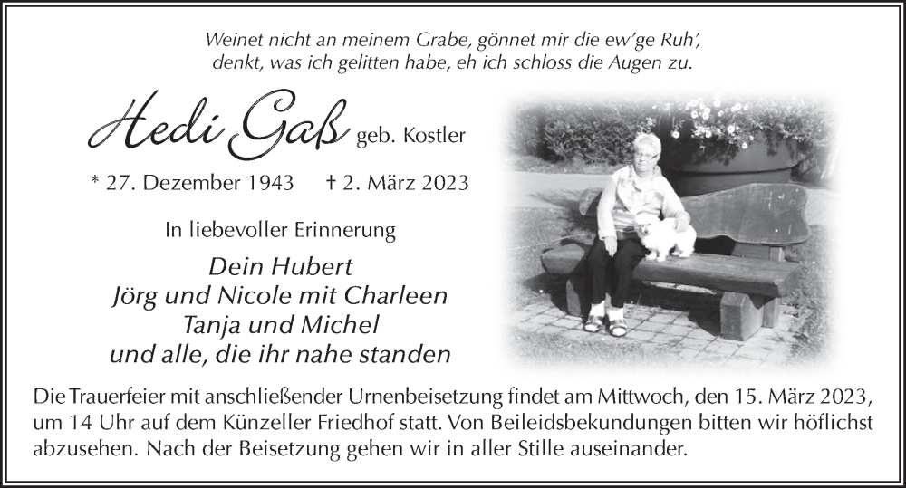 Hier finden Sie alle Traueranzeigen aus der Zeitung, die bisher für Hedi Gaß erschienen sind. Weitere Traueranzeigen, die in der Zeitung erscheinen, werden hier ebenfalls aufgelistet