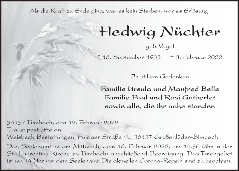 Hier finden Sie alle Traueranzeigen aus der Zeitung, die bisher für Hedwig Nüchter erschienen sind. Weitere Traueranzeigen, die in der Zeitung erscheinen, werden hier ebenfalls aufgelistet