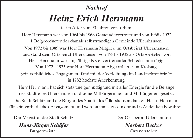 Hier finden Sie alle Traueranzeigen aus der Zeitung, die bisher für Heinz Erich Herrmann erschienen sind. Weitere Traueranzeigen, die in der Zeitung erscheinen, werden hier ebenfalls aufgelistet