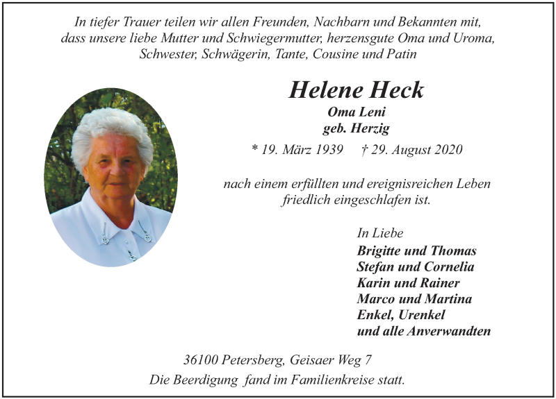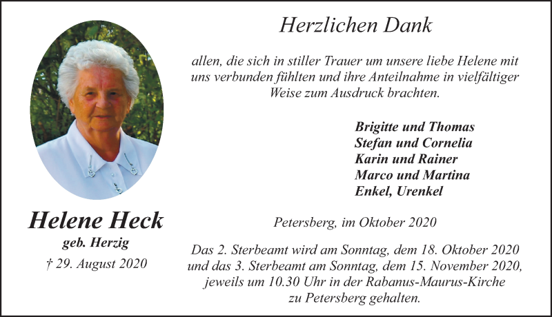Hier finden Sie alle Traueranzeigen aus der Zeitung, die bisher für Helene Heck erschienen sind. Weitere Traueranzeigen, die in der Zeitung erscheinen, werden hier ebenfalls aufgelistet