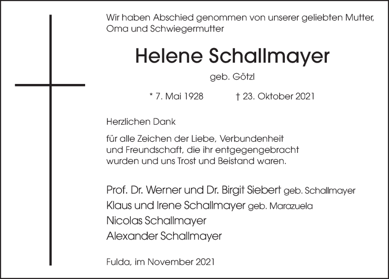 Hier finden Sie alle Traueranzeigen aus der Zeitung, die bisher für Helene Schallmayer erschienen sind. Weitere Traueranzeigen, die in der Zeitung erscheinen, werden hier ebenfalls aufgelistet