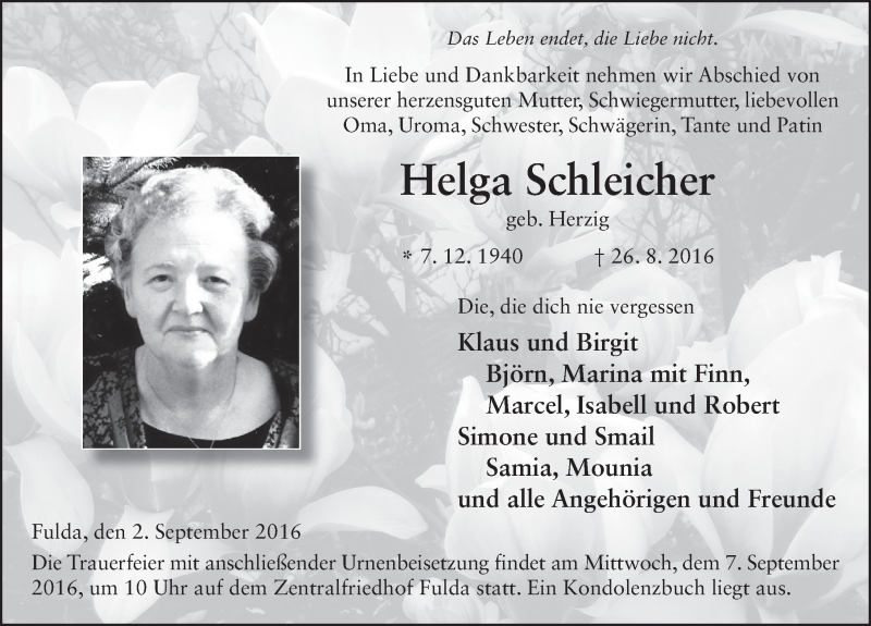 Hier finden Sie alle Traueranzeigen aus der Zeitung, die bisher für Helga Schleicher erschienen sind. Weitere Traueranzeigen, die in der Zeitung erscheinen, werden hier ebenfalls aufgelistet