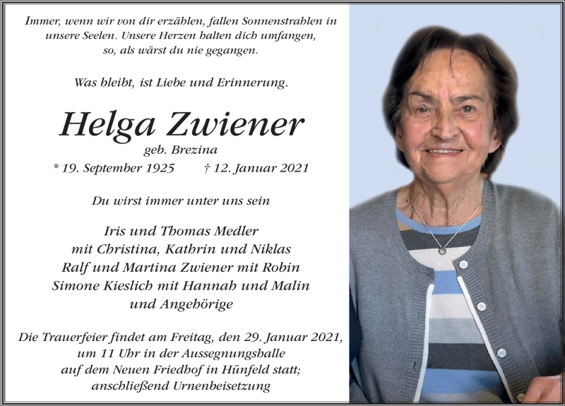 Hier finden Sie alle Traueranzeigen aus der Zeitung, die bisher für Helga Zwiener erschienen sind. Weitere Traueranzeigen, die in der Zeitung erscheinen, werden hier ebenfalls aufgelistet