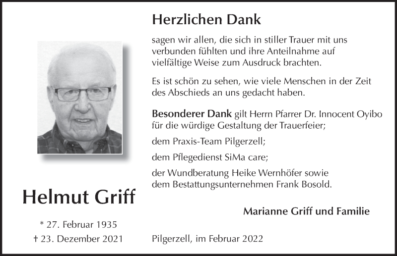 Hier finden Sie alle Traueranzeigen aus der Zeitung, die bisher für Helmut Griff erschienen sind. Weitere Traueranzeigen, die in der Zeitung erscheinen, werden hier ebenfalls aufgelistet