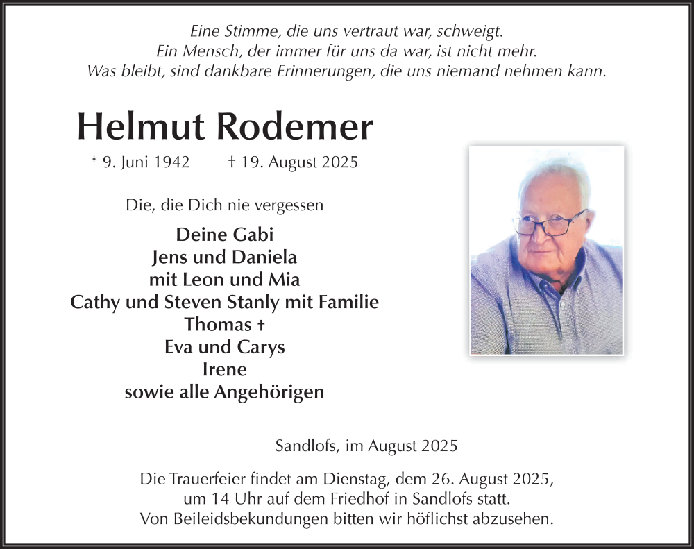 Hier finden Sie alle Traueranzeigen aus der Zeitung, die bisher für Helmut Rodemer erschienen sind. Weitere Traueranzeigen, die in der Zeitung erscheinen, werden hier ebenfalls aufgelistet