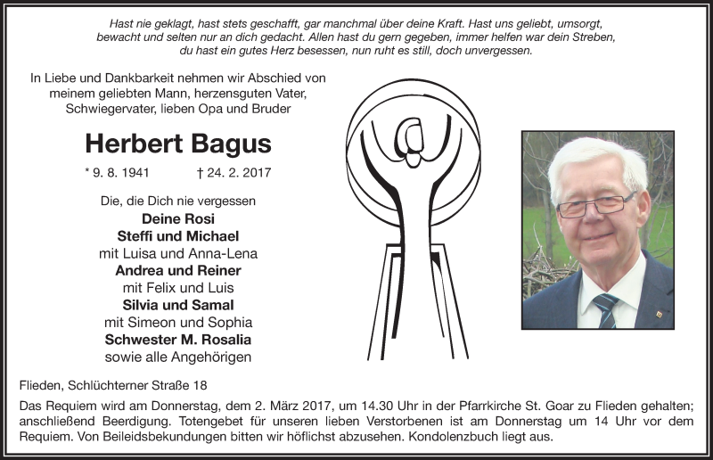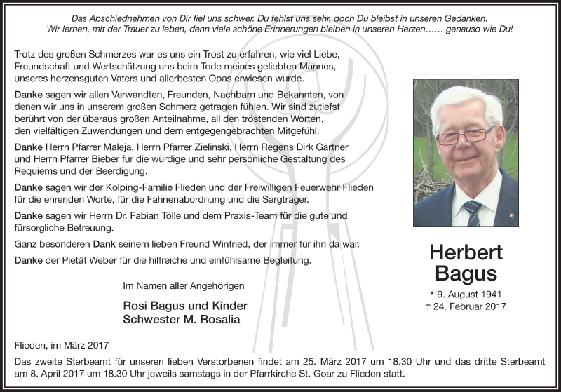 Hier finden Sie alle Traueranzeigen aus der Zeitung, die bisher für Herbert Bagus erschienen sind. Weitere Traueranzeigen, die in der Zeitung erscheinen, werden hier ebenfalls aufgelistet