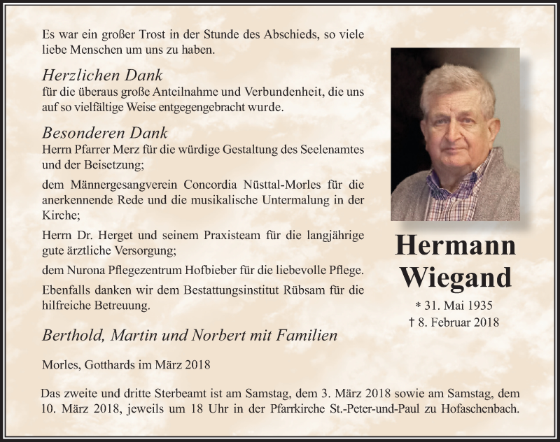 Hier finden Sie alle Traueranzeigen aus der Zeitung, die bisher für Hermann Wiegand erschienen sind. Weitere Traueranzeigen, die in der Zeitung erscheinen, werden hier ebenfalls aufgelistet